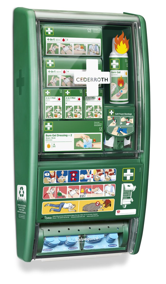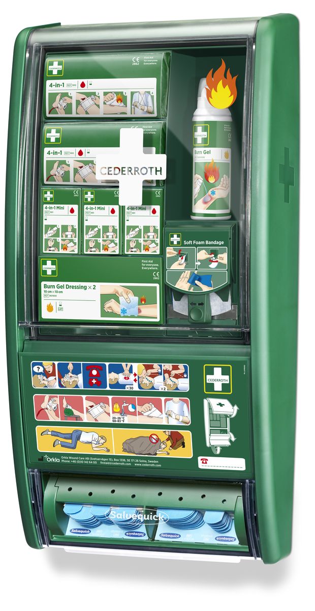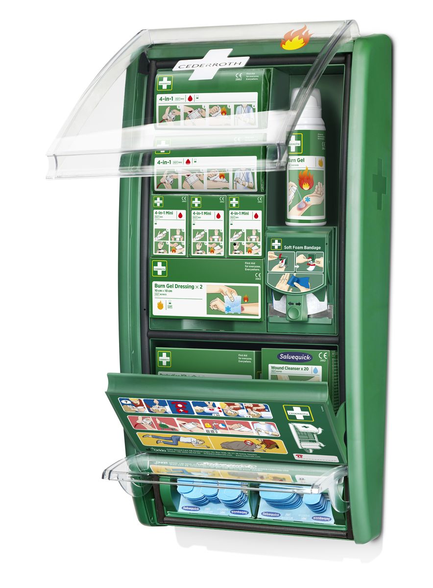 Die Erste-Hilfe-Station mit Zusatzausrüstung für Verbrennungen.Eine Erste-Hilfe-Station für alle Berufe mit hohem Risiko von Verbrennungen und Schnittverletzungen, z. B. Köche, Elektriker und Schweißer. Mit der richtigen Ausrüstung in Reichweite kann bei Unfällen schneller und wirksamer Erste Hilfe geleistet werden.