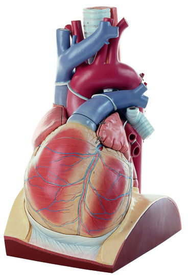 ca. 2fach vergrößert, aus SOMSO-Plast®. Das Modell ist durch einen senkrecht zur Kammer-Septum-Ebene verlaufenden Schnitt eröffnet und in zwei Hälften zerlegbar, nachdem der Aortenbogen und die obere Hohlvene abgenommen worden sind. Darstellung der beiden Herzkammern und Vorhöfe mit zwei- und dreizipfeligen Segelklappen sowie den Taschenklappen. In 3 Teile zerlegbar, auf einem transparenten Sockel in Form der Zwerchfellkuppel mit Andeutung des Herzbeutels.