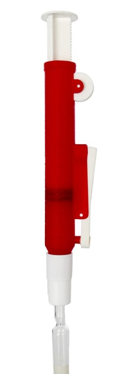 aus säurefestem Kunststoff, passend für fast alle Pipetten. Durch Drehen eines griffgünstig angebrachten Handrades wird im Gerät ein Kolben bewegt, der in der eingesteckten Pipette die Flüssigkeit nach Bedarf einsaugt oder herausdrückt. So gelingt genaues und sicheres Pipettieren mit Glaspipetten