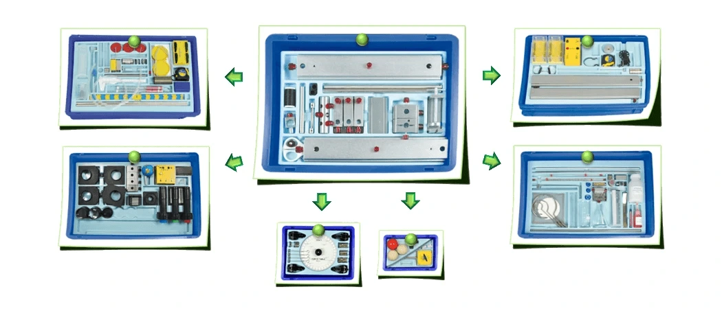 Die Geräte und Teile für einen bestimmten Themenkreis eines physikalischen Teilgebietes sind sinnvoll in einer Box zusammengefasst. So können die Versuche zum gewählten Themenkreis von den Schülerinnen und Schülern experimentell durch möglichst wenig Material erarbeitet werden. Das sorgt für einen material- und platzeffizienten Umgang am Arbeitsplatz.