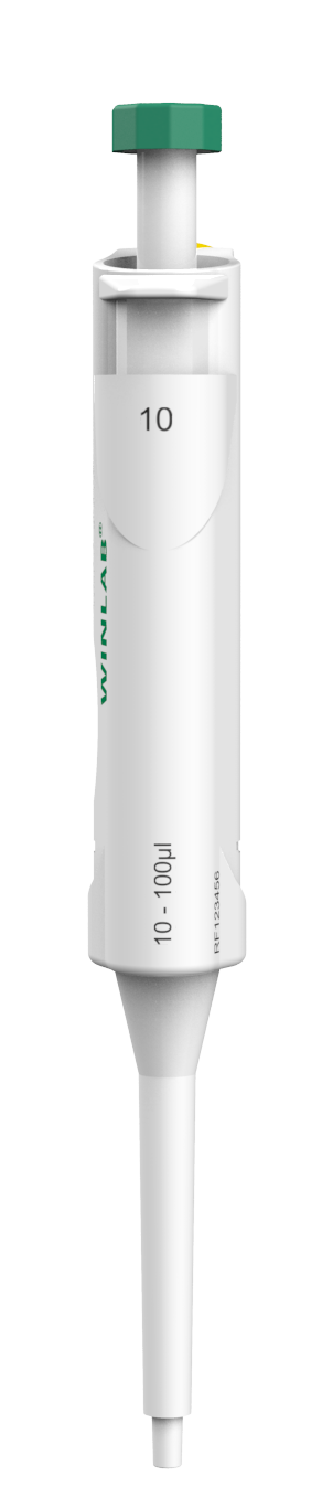 - Die WINLAB Pipetten liegen gut in der Hand – dank des geringen Gewichts und des grünen Softgriffes aus Elastomer. Der Abwurf der Pipettenspitzen erfolgt durch einfachen separaten Druck.