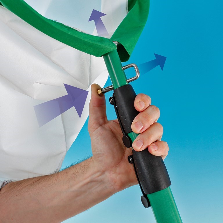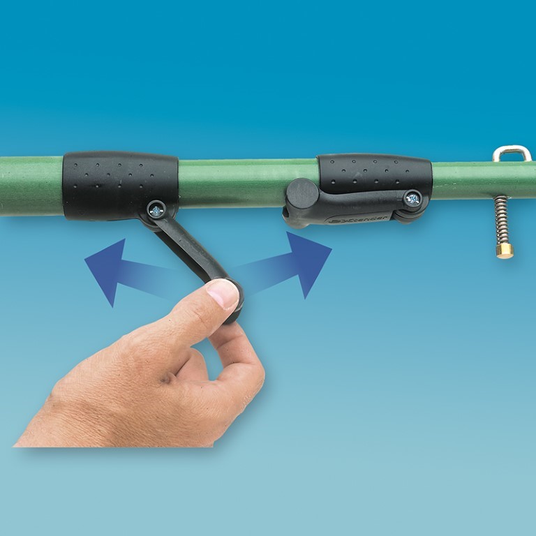 - Durch einen sicher fixierenden und sehr einfach zu bewegenden Klapp mechanismus kann die Teleskopstange für schwierig zugängige Uferbereiche oder für größere Buschwerke und Bäume ausgezogen werden und zusammen mit den Netzen eingesetzt werden.