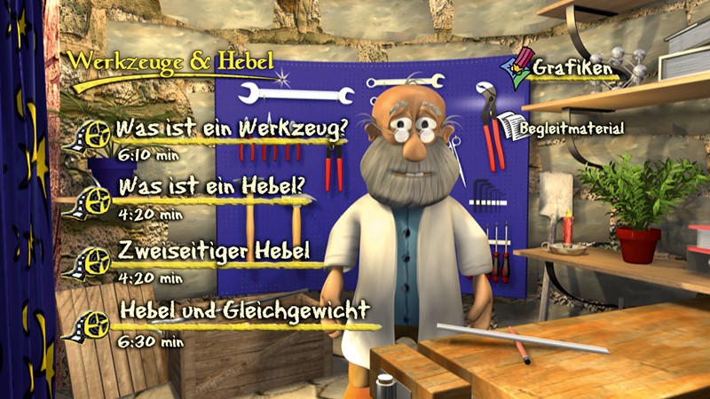 4 Filme über einfache Werkzeuge, die sich die Hebelwirkung zunutze machen. Professor Lunatus ist mit dabei, wenn Werkzeuge und Hebel untersucht werden.