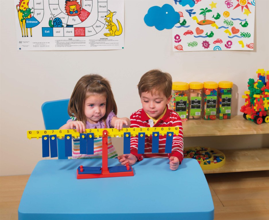 Mit dieser Waage können Kinder spielend einfach die Grundrechenarten üben. Kunststoffgewichte können rechts und links an je 10 Haken angehängt werden.