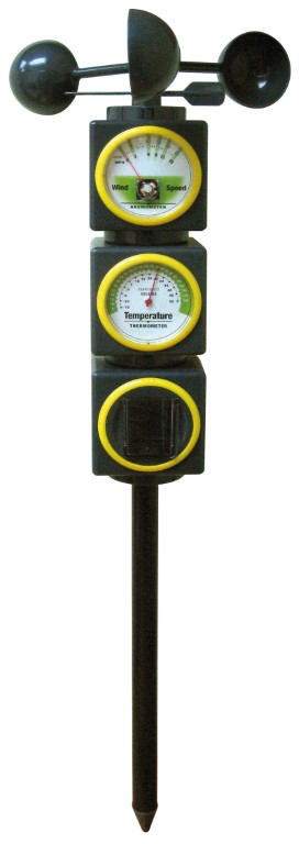 3-teilig Bestehend aus: Anemometer (Windgeschwindigkeit und Windrichtung), Thermometer und Niederschlagsmesser.