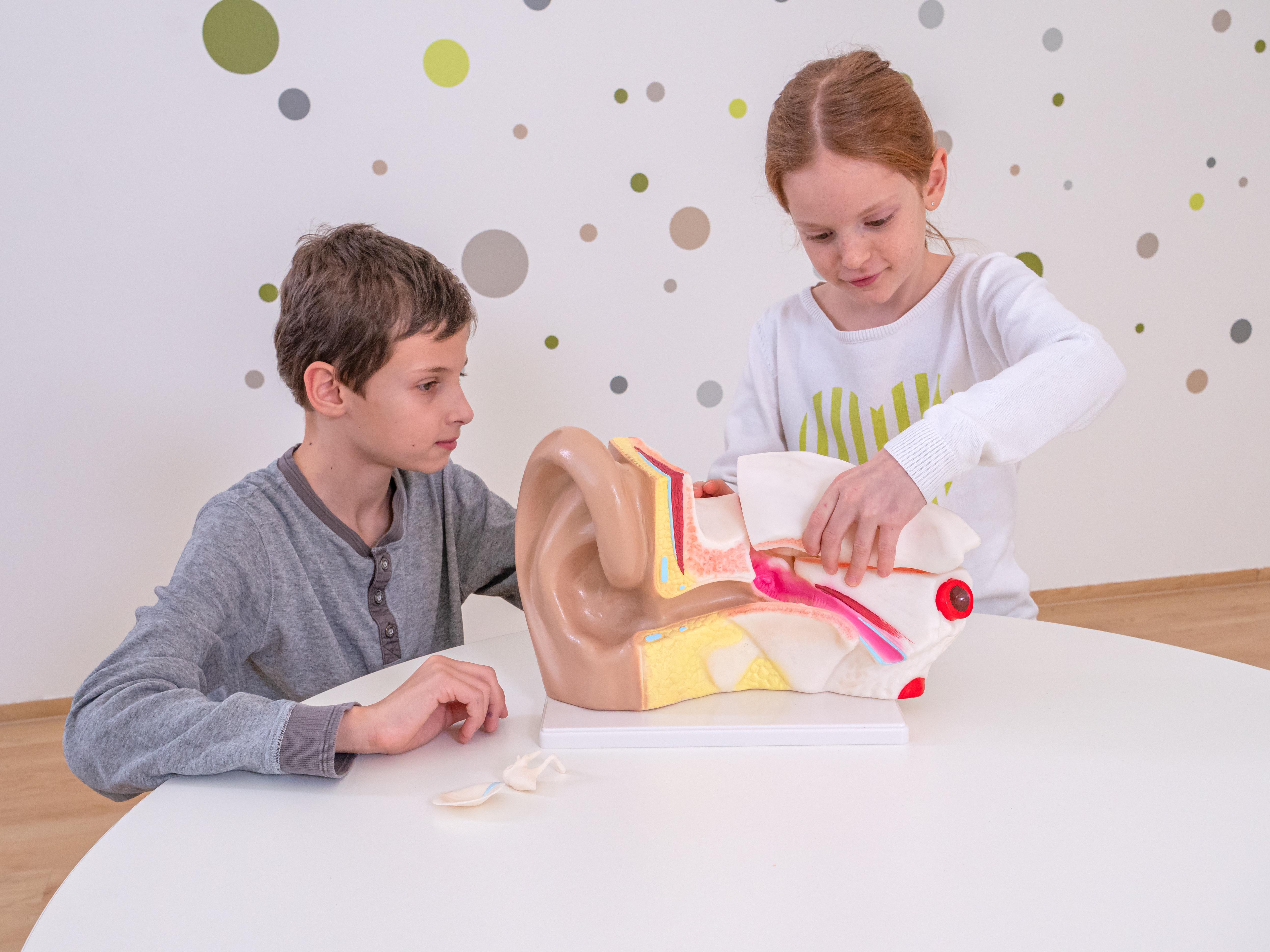 Ohrmodell mit Darstellung von Außen-, Mittel- und Innenohr. Die 3 Gehörknöchelchen sind herausnehmbar. Darstellung von Labyrinth mirt Schnecken.