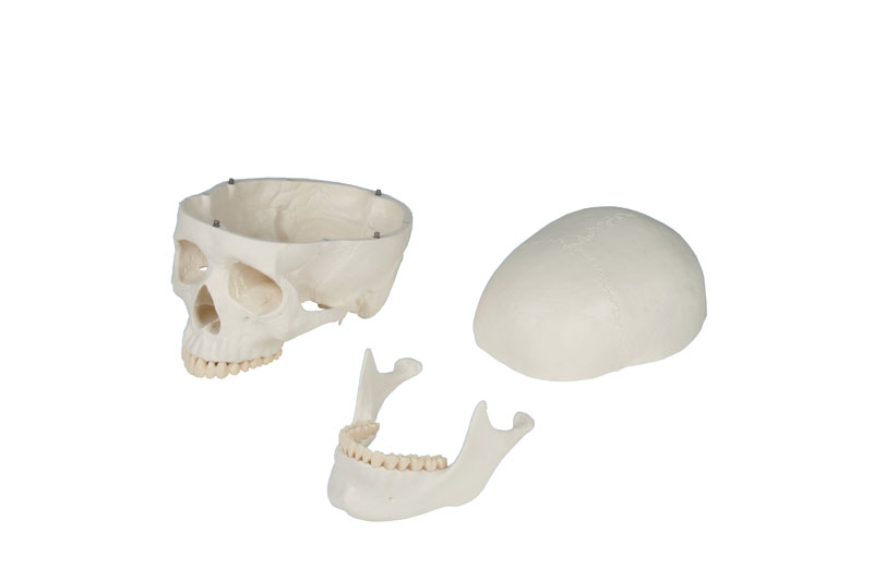 Der dreiteilige Schädel wurde digitalisiert und so angepasst, dass er genau der Standard-Anatomie entspricht. Die Größe entspricht der europäischen Durchschnittsgröße, alle wichtigen Strukturen, Fissuren, Foramina und Processus sind vorhanden. Der Schädel ist zerlegbar in Schädelbasis, Unterkiefer und Schädeldach. Das Schädeldach ist mit Metallstiften an der Schädelbasis ausgerichtet und wird durch Magnete gehalten. Anders als bei fast allen Schädeln von Wettbewerbern kann durch diese Technologie kein Stift mehr abbrechen, und es entsteht kein Spalt mehr zwischen Schädeldach und Schädelbasis. Es gibt keine störenden Verschlusshaken, die sich verbiegen oder abbrechen können.
