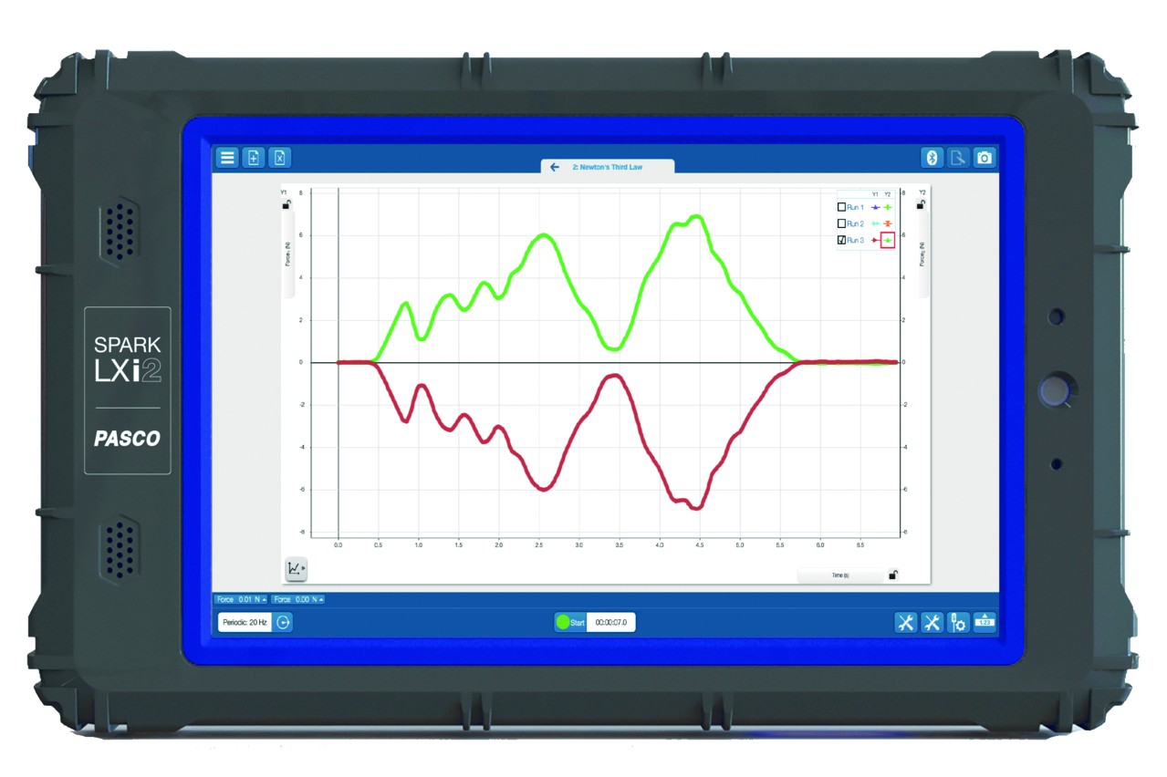 Der SPARK LXi ist für den Einsatz mit klassischen blauen und smarten (drahtlosen) PASCO-Sensoren konzipiert. Er kann bis zu acht drahtlose Sensoren gleichzeitig koppeln und verfügt zusätzlich über zwei Anschlüsse für klassische blaue Sensoren (PASPORT) sowie zwei Anschlüsse für den mitgelieferten schnellen Temperatur-Messfühler und den Spannungs-Messfühler.