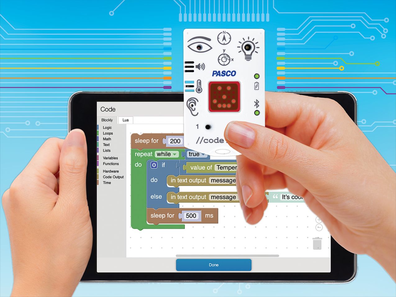 In diesem Versuchskit sind die benötigten Sensoren und Zubehör für Sie direkt zusammengefasst. Der Smart CO2-Sensor in Verbindung mit einer Smart Sensorplattform code.Node ergibt die CO2-Ampel. Der Sensor überwacht den CO2-Gehalt der Luft. Auf dem code.Node wird die Luftqualität durch den farbigen Wechsel einer Ampel ooptisch angezeigt. Wird der eingestellte Grenzwert überschritten, erklingt ein kurzer Warnton. Das Programm, das diese Geräte zu einer konfigurierbaren CO2-Ampel verbindet realisieren wir in der eingebauten Programmierumgebung Blockly von SPARKvue.