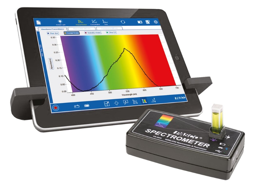 Dieses Spektrometer kann schnurlos (Bluetooth) mit iPad betrieben werden oder per USB-Kabel an Computern (PC / Mac). Es dient zur Messung von Absorption, Transmission und Fluoreszenz, bei Einsatz des Lichtleiterkabels (Zubehör) auch zur Messung der Intensität. Die mitgelieferte Software ist sehr einfach zu bedienen und daher gerade für den Einstieg in die Spektroskopie geeignet. Von den angezeigten Spektren können Schnappschüsse erstellt und abgespeichert werden.