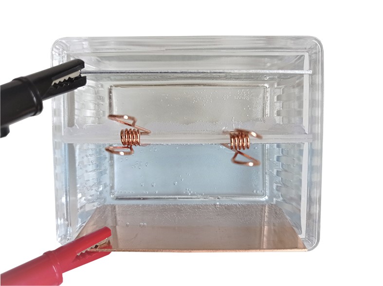 Der Elektrolysetrog mit Diaphragma dient der Erzeugung zweier Halbzellen. Als Diaphragma dient ein spezielles Filterpapier, das zwischen zwei Kunststoffrahmen mit Loch eingespannt und mit den beigefügten Klammern fixiert wird. Die eine Hälfte des Kunststoffrahmens ist fest im Zelltrog eingeschweißt. An dieses Teil wird die zweite Hälfte mit dem Diaphragma herangeführt und mit den Klammern fixiert. So sind Versuche mit und ohne Diaphragma möglich.