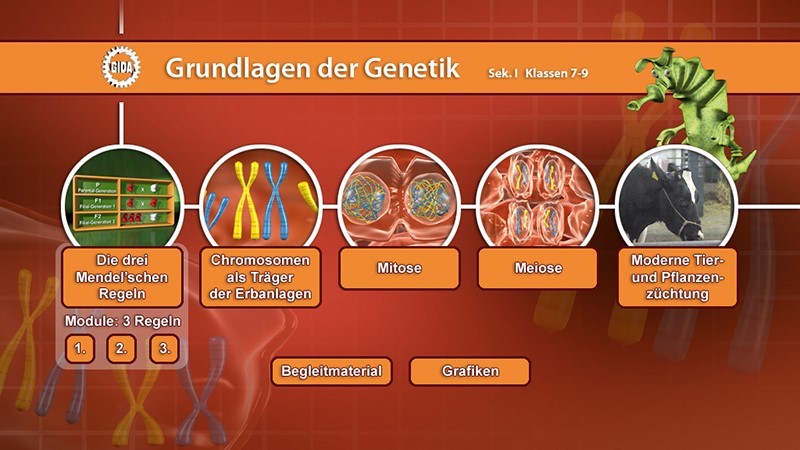Cartoonfigur „Geni“ führt durch 5 Filme zu den klassischen Grundthemen der Genetik, auch unter modernen Aspekten.