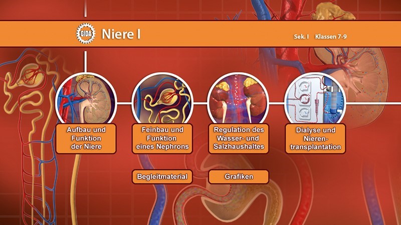 4 Filme zu den Grundlagen der Funktion der Nieren, zum Harnstoffhaushalt, zu Dialyse und Nierentransplantation.