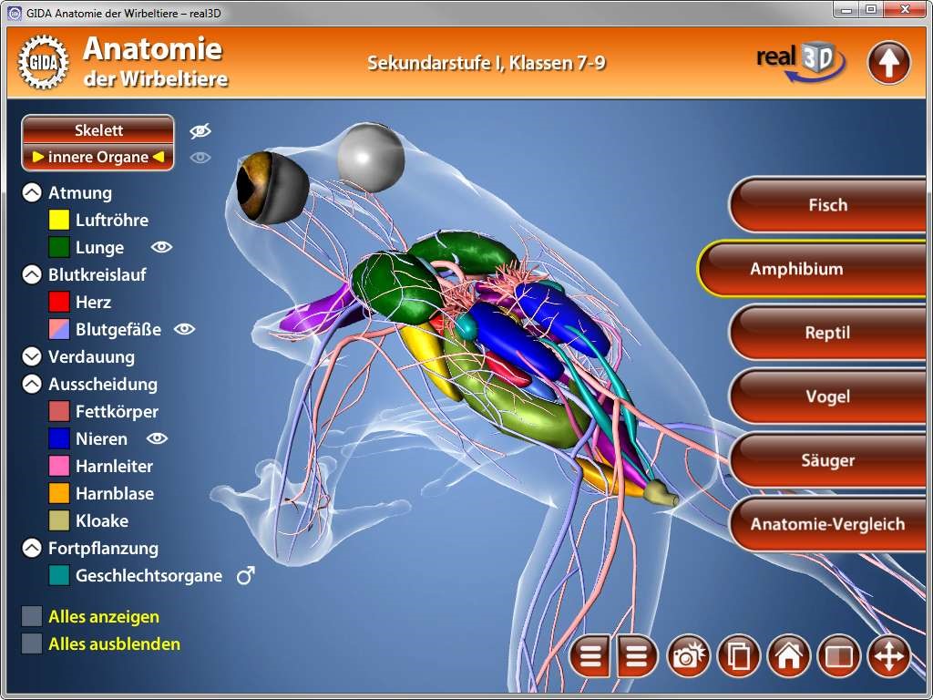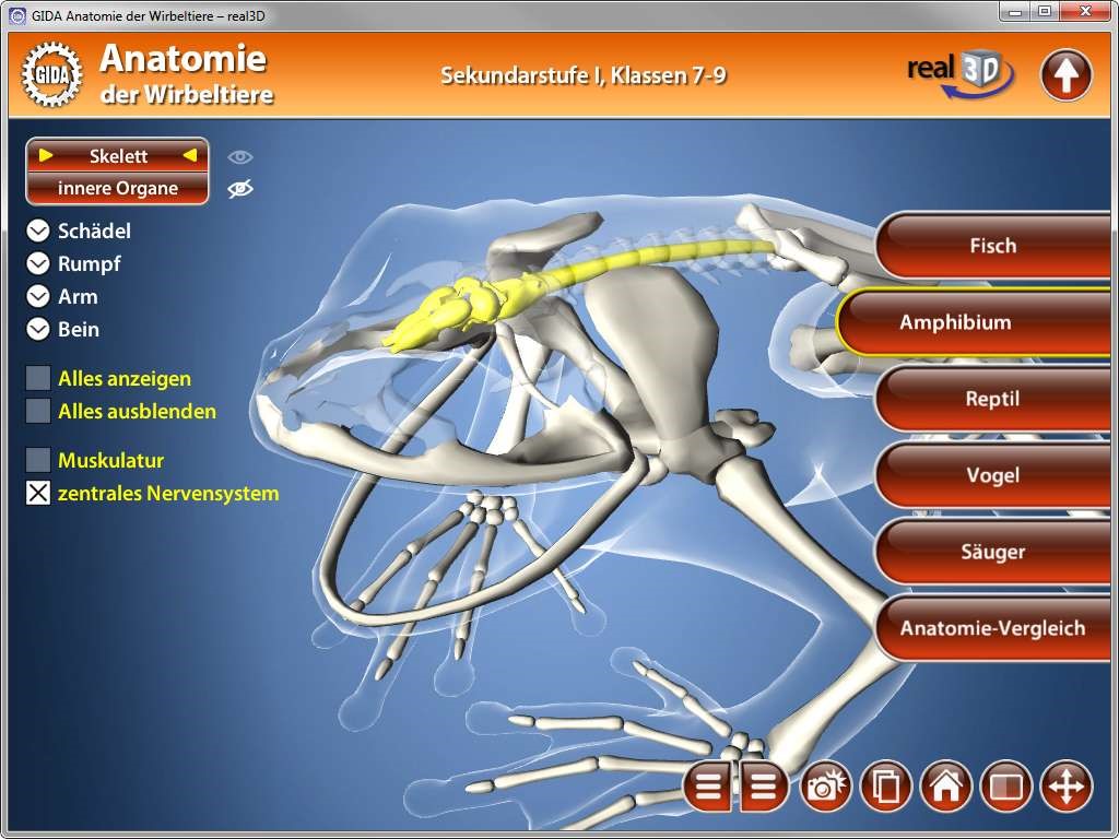 Die real3D-Software bietet einen virtuellen Überblick über die Anatomie der Wirbeltiere, der "Chordatiere mit einer Wirbelsäure". Die 5 Klassen innerhalb der "Wirbeltiere" werden anhand der bekanntesten Vertreter behandelt. Skelett, innere Organe, Muskel und ZNS können mit dieser Software intensiv erkundet und auch verglichen werden.