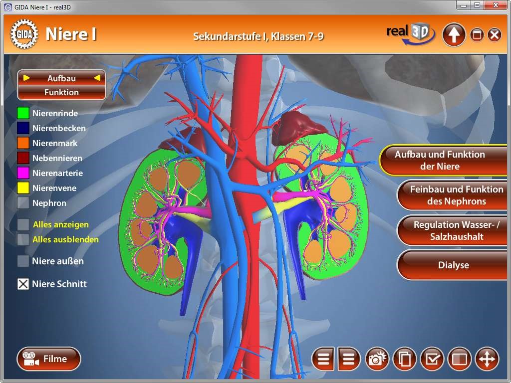 Die real3D-Software bietet einen virtuellen Einblick in Aufbau und Funktion der Niere. Anhand von 6 bewegbaren 3D-Modellen können einzelne Teilbereiche von Lehrern demonstriert und von Schülern aktiv nachvollzogen werden.