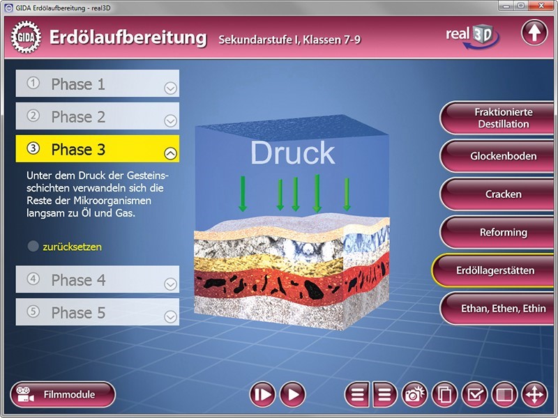 viele individuelle Unterrichtsstile.Vielfältige Einblicke in den Ablauf der Erdölaufbereitung; Erdöl-Lagerstätte; Aufbau und