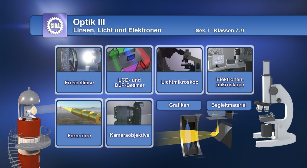 6 Filme zu verschiedenen Linsensystemen in Projektion, Betrachtung und Spiegelreflexkamera. Alle Filme geben jeweils einen kurzen Überblick über die historische Entwicklung der Geräte und skizzieren dann in leicht verständlicher Form ihre Funktionsweise.