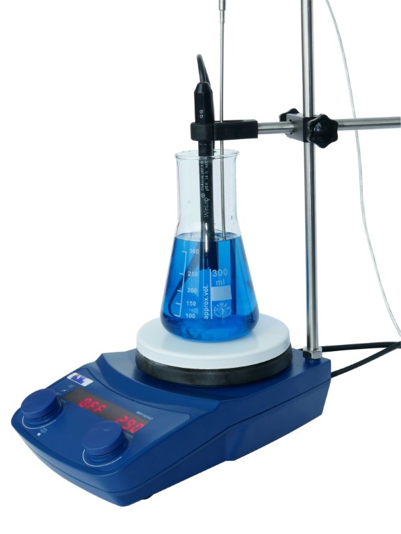 - Die Konstruktion der Heizplatte verhindert weitgehend ein Eindringen von Flüssigkeit in das Innere des Magnetrührwerkes