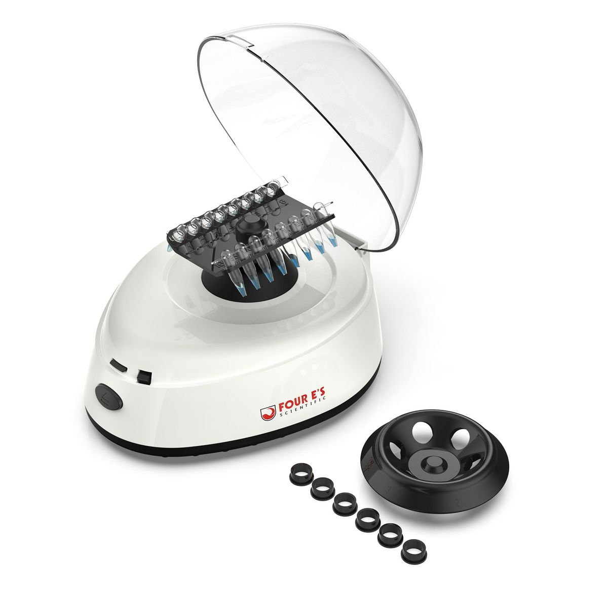 Mit zwei Rotoren für 6 Reaktionsgefäße in kreisförmiger Anordnung und für 8 Reaktionsgefäße in Reihenanordnung. Natürlich ist die Mini-Zentrifuge mit einem Sicherheitsmechanismus ausgestattet der die Deckelöffnung erst nach Stillstand zulässt.