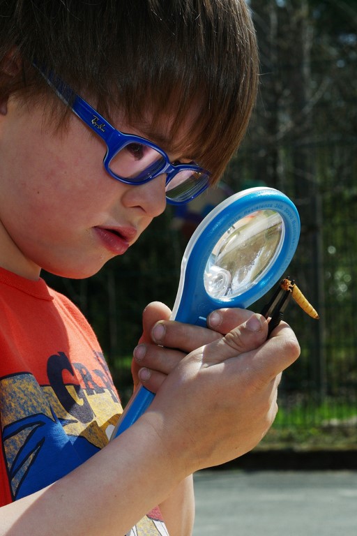 Große aufstellbare Lupe zur Untersuchung von Tieren und Objekten.