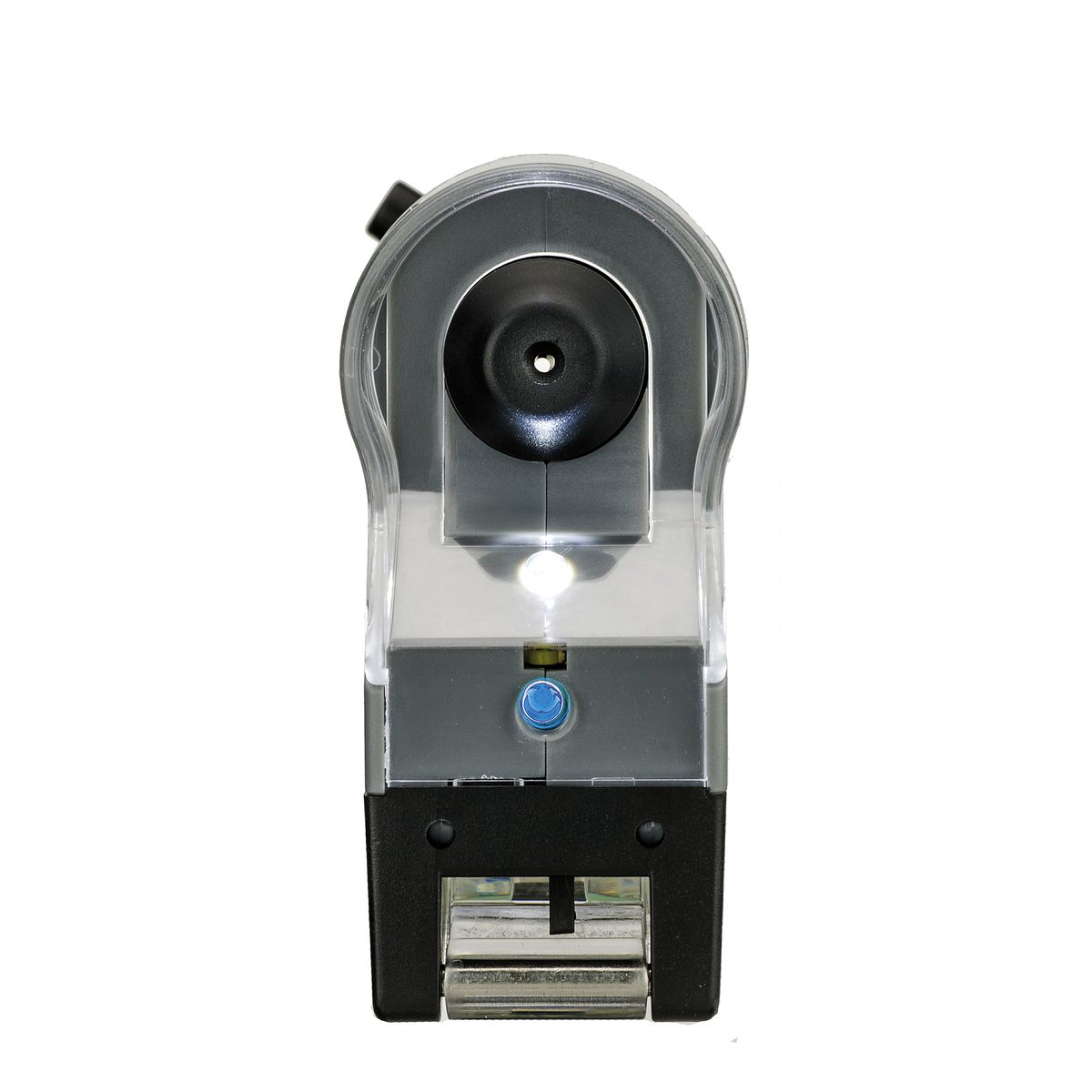 Ein besonderes Merkmal dieses Taschenmikroskops ist das einzigartige Auflagesystem für Objektträger aus asphärisch geschliffenen Linsen, das sich ganz einfach nach unten klappen lässt und für absolut klare und scharfe Abbildungen in allerhöchster Bildqualität sorgt.
