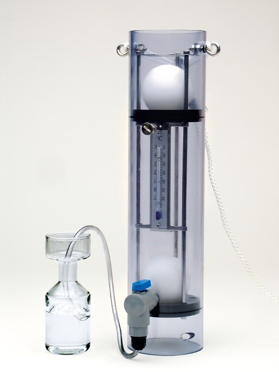 Professionelles Modell für die exakte Wasserprobenahme aus gewünschter Tiefe. Das Funktionsprinzip dieses zuverlässigen Gerätes ist einfach zu beschreiben. Das Probenahmegerät wird in die gewünschte Tiefe herabgelassen, dabei strömt das Wasser durch die beiden Kugelventile.
