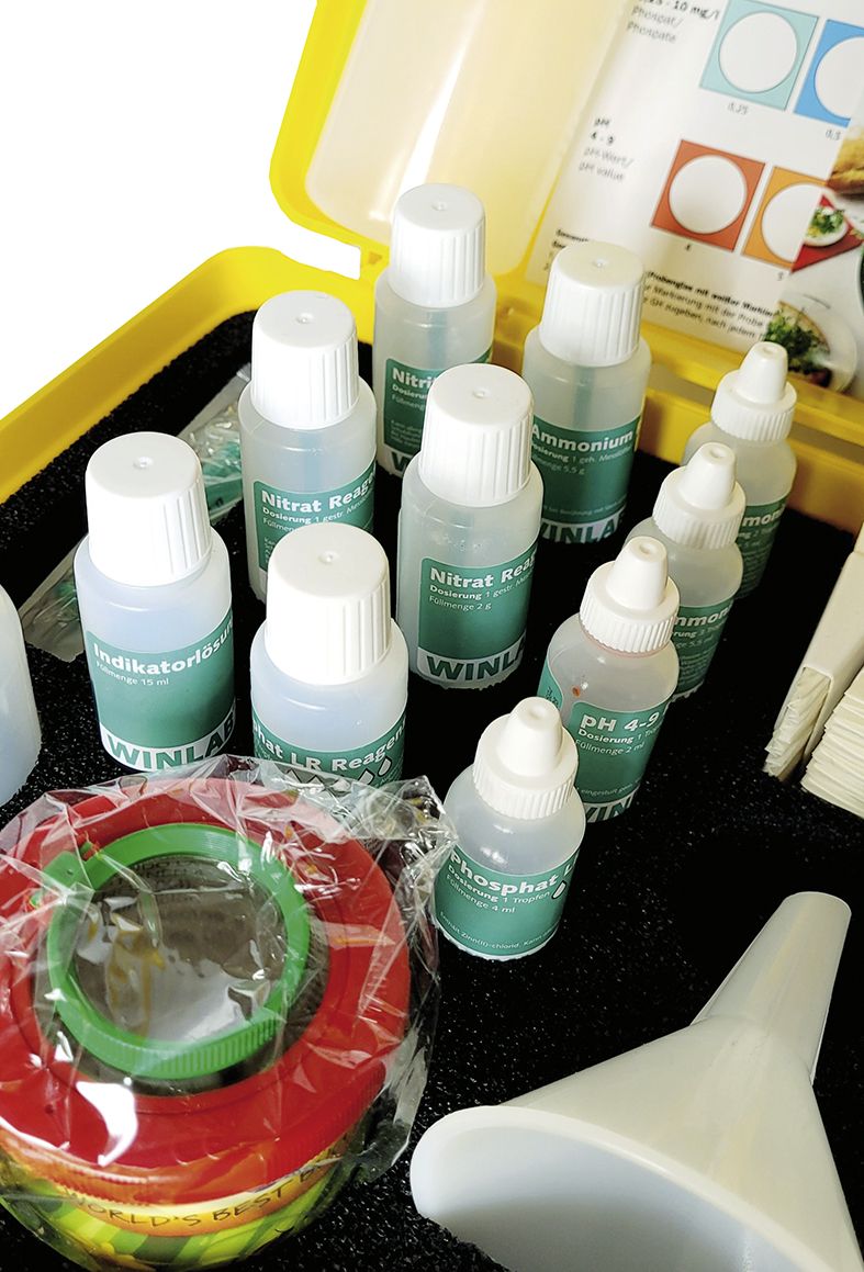 - Reagenzien-Testsets für je 50 Bestimmungen: pH Wert / Ammonium / Nitrat / Nitrit / Phosphat / Wasserhärte (Gesamthärte)
