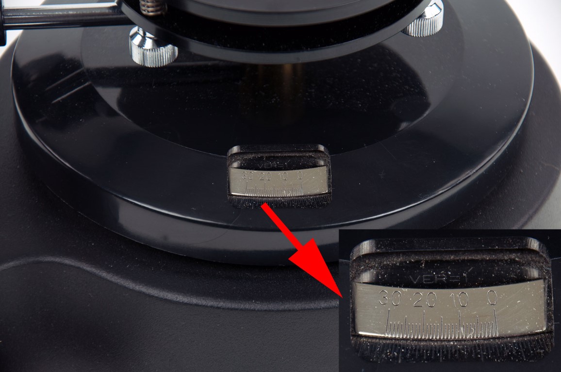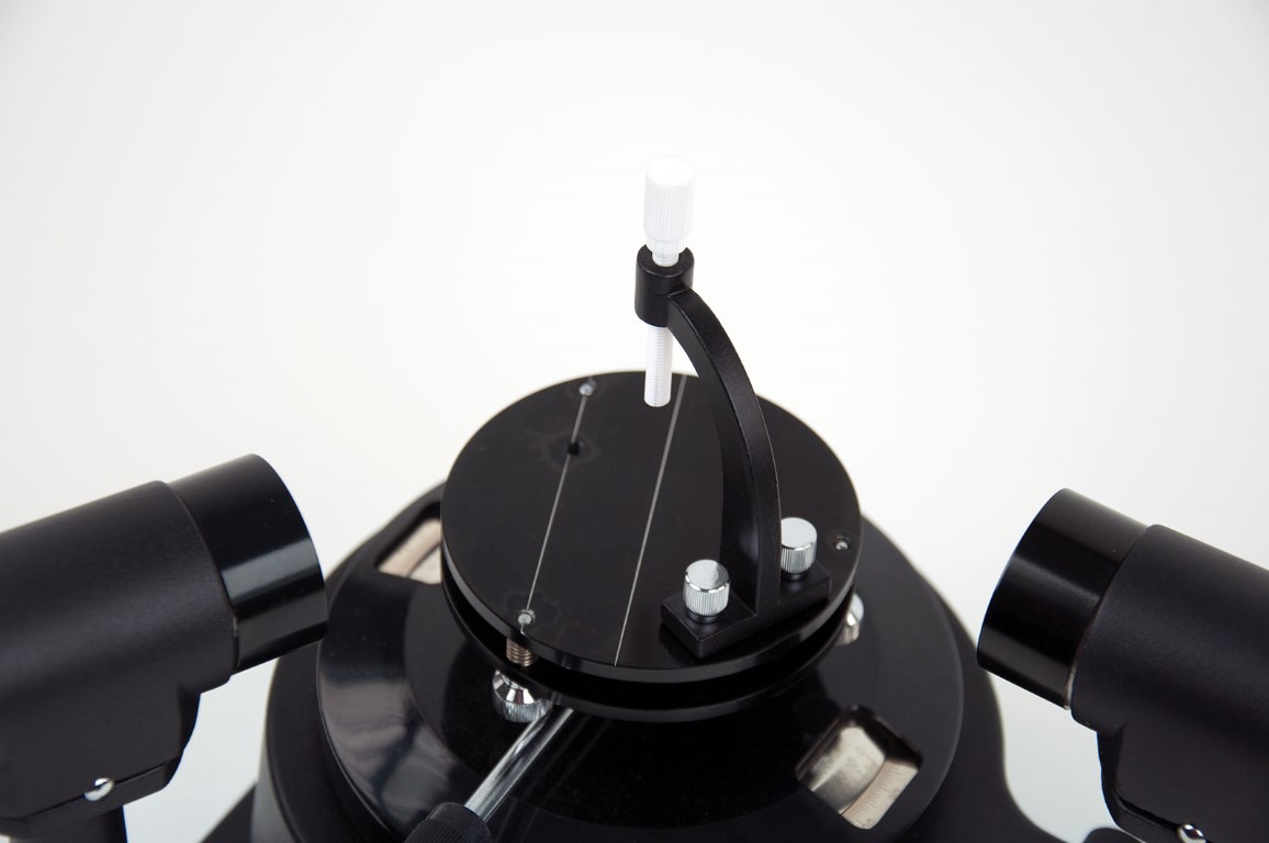 Um den Tisch schwenkbares Beobachtungsfernrohr, mit Feintrieb zur Einstellung der Brennweite. Feststellschraube des Schwenkarmes mit zusätzlichem Feintrieb welcher minimale, stabile Gradeinstellungen ermöglicht.