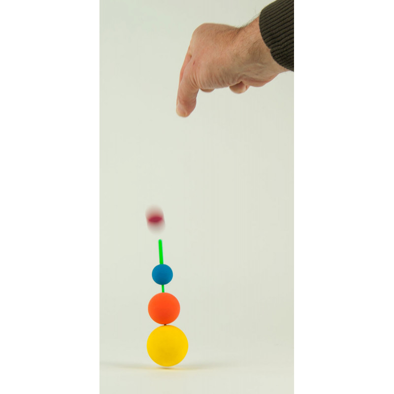 Zur imposanten Demonstration von Energieerhaltung und Impuls; 4 übereinander liegende, verschieden große Gummibälle, angeordnet auf einer Kunststoffachse.