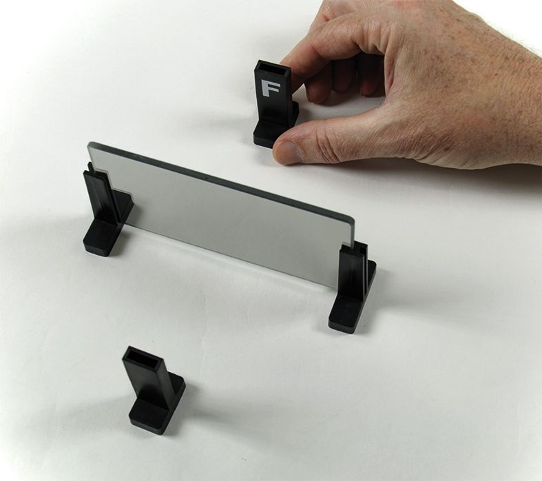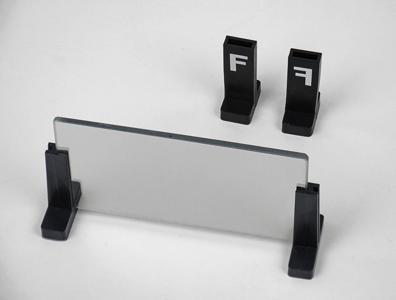 Halbdurchlässiger Spiegel,135 x 70 mm, in 2 Haltebügeln, zwei Objekte mit „F“, eines davon spiegelverkehrt.