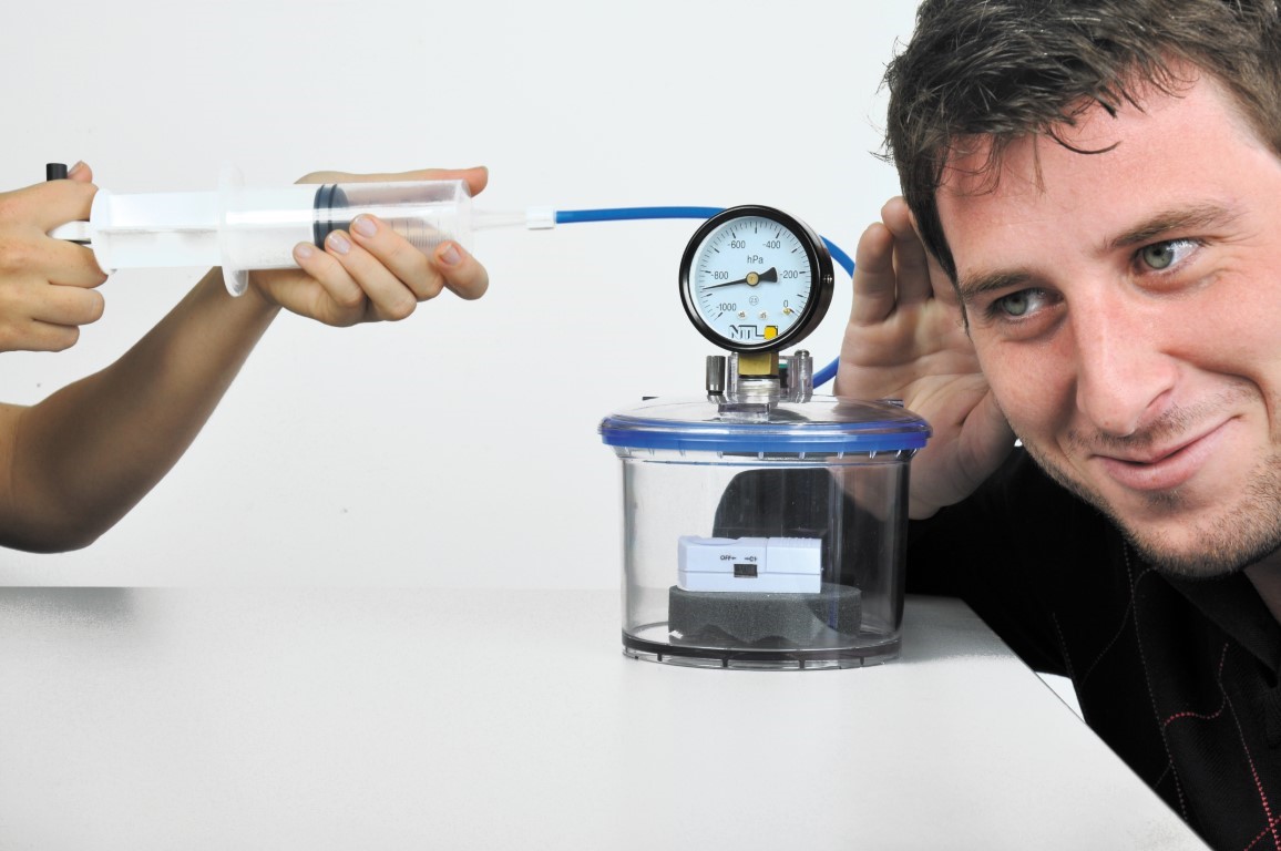 - standardmäßig bei uns enthalten zusätzlich zum Manometer im Vakuum-Deckel: ➜ Manometer SE, für Boyle-Mariotte-Versuch