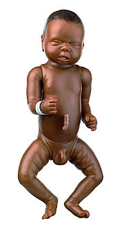 aus weichem SOMSO-Plast®. Mit Kugelgelenken und nach hinten nachgebendem, leicht beweglichem Kopf. Mit geöffnetem Mund, Nabelschnur und Anus. Zum Baden, Wickeln und für Halte-übungen geeignet. Unbekleidet. Kopfumfang 34 cm.